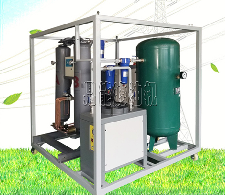 ZGF系列干燥空氣發生器主要由空壓機、制冷機、吸附器、三級精密干燥空氣過濾器、電控系統、減壓閥、露點儀等部分組成。壓縮后的空氣進入預冷器冷卻后進入離心脫水過濾器中進行一次水氣分離,再進入制冷機深度冷凝脫水,大部分水氣被凝結成水,空氣進行二次聚結脫水過濾器,然后進入可再生干燥空氣過濾器,將剩余水氣吸附,吸附脫水后的干燥空氣進入0.01μm高精度過濾器中去除微粒后經穩壓閥輸送到需要干燥氣體的設備中,以保證變壓器不會因雜質降低絕緣強度。露點檢測儀檢測空氣露點,當空氣不合格時有報警。